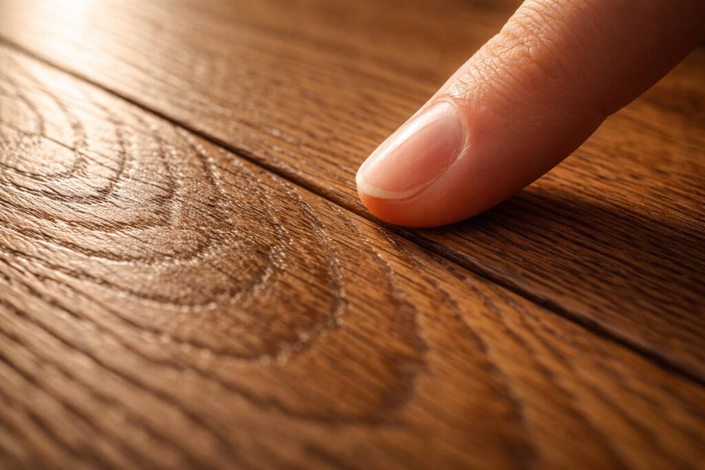 Vinyl SPC (Stone Plastic Composite) atau LVT (Luxury Vinyl Tile) datang dengan lapisan wear layer 0,3–0,5 mm yang dilindungi UV coating. Tekstur embossed-in-register—proses di mana cetakan tekstur menyusuri gambar serat—menjadi senjatanya. Ketebalan total 2 mm, 3 mm, bahkan 5 mm memberikan underfoot comfort yang tak dimiliki keramik. Tapi apakah tekstur ini lebih dari sekadar ilusi visual?