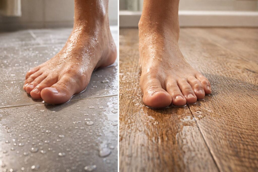 Vinyl SPC? Bukan R Scale, tapi DCOF (Dynamic Coefficient of Friction)-nya harus >0,3 untuk interior wet. Vinyl bermutu dengan urethane top coat bisa mencapai 0,5 DCOF. Lebih penting: underlayment foam-nya menyerap tekanan, mengurangi risiko tergelincir drastis. Di kamar mandi, vinyl dengan hydro-lock click system justru lebih forgiving daripada grout line keramik yang bisa jadi moldy dan licin.