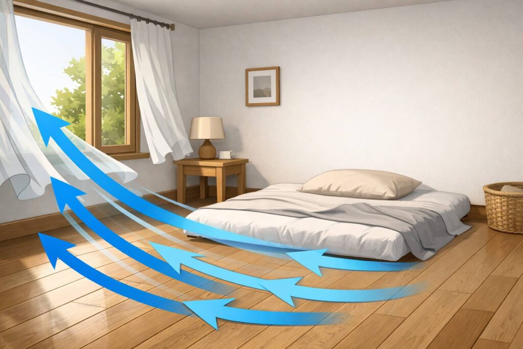 Udara dingin mengalir seperti air. Jika ada celah di bawah pintu atau jendela, arus udara akan merayap di permukaan lantai dan menyentuh langsung tubuh yang terbaring. Ini bukan mitos, tapi fisika dasar. Efeknya? Otot tegang, sendu, dan tidur tidak nyenyak.