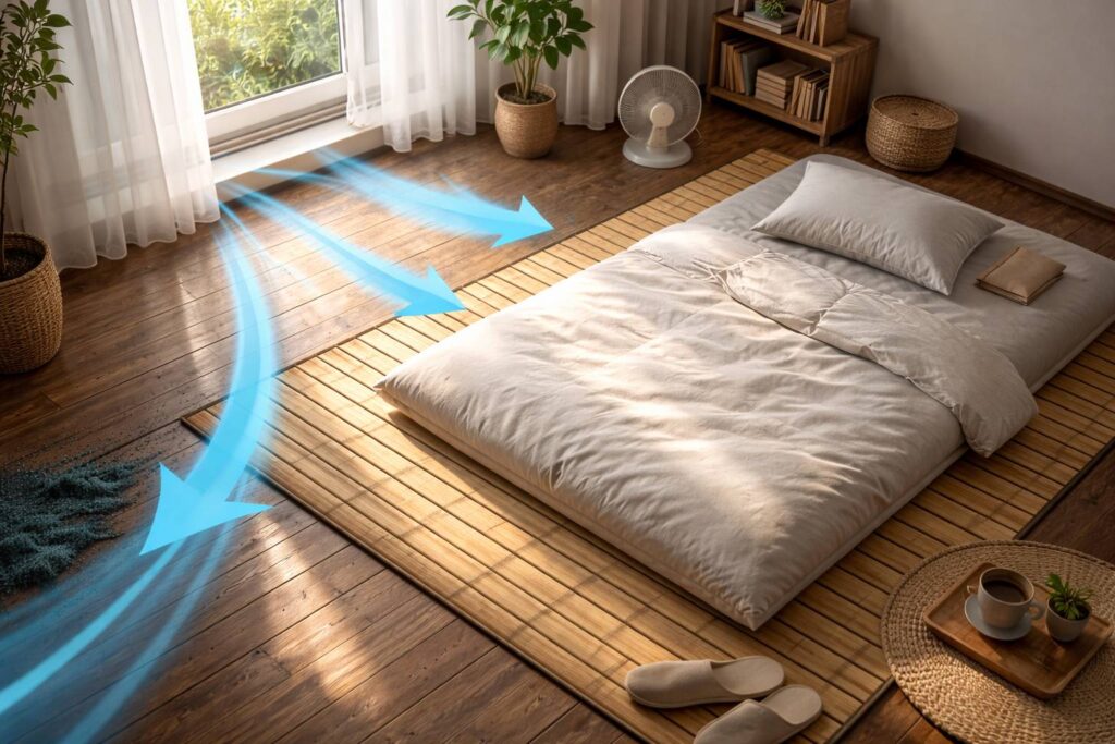 • Material alas: Letakkan bamboo slatted mat atau tatami asli (bukan plastik) di bawah kasur. Ini jembatan udara sekaligus penyerap kelembapan.