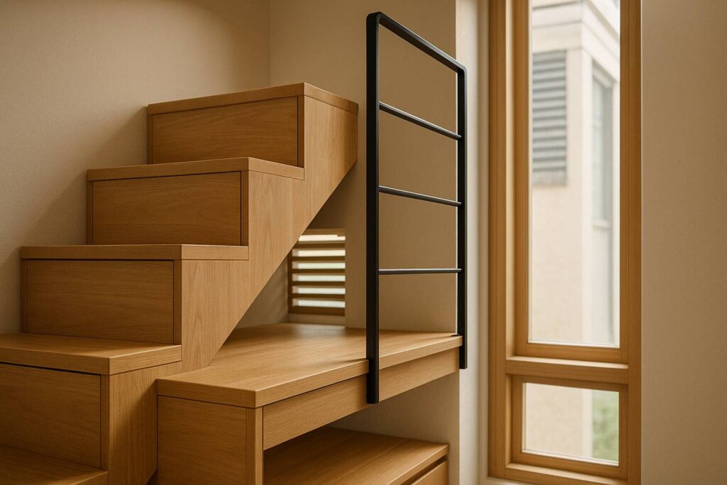 Di plafon rendah, setiap sentimeter adalah properti. Lupakan tangga konvensional. Tangga laci atau tangga tarik (folding ladder) menghemat 0,8 m² ruang lantai. Bordes tidak boleh lebih lebar dari 0,6 meter, cukup untuk satu kaki saja.