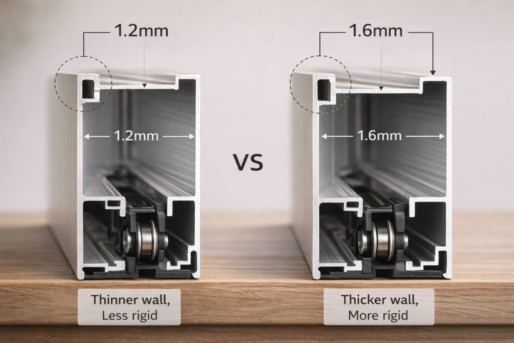 Pintu geser aluminium murah sering menghasilkan suara ngelinding yang tidak nyaman. Ini karena profil terlalu tipis (kurang dari 1.2 mm) sehingga tidak stabil saat digeser. Getaran juga akan terasa jika kaca terlalu berat untuk frame yang digunakan.