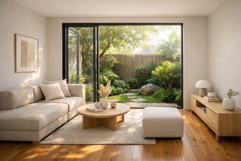Selain tidak perlu radius buka, pintu geser aluminium bisa dipasang flush dengan dinding. Anda bisa meletakkan sofa atau rak buku tepat di sebelahnya tanpa khawatir benturan. Di apartemen studio, ini berarti perbedaan antara punya meja makan atau tidak.
